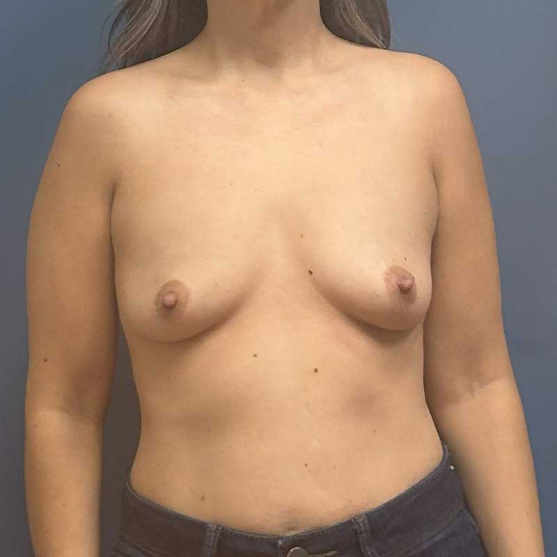 A 43-year-old female with a small A cup desired a full B cup without excessive volume. She received 325cc high-profile smooth silicone implants in the dual plane and increased from an A to a C cup.