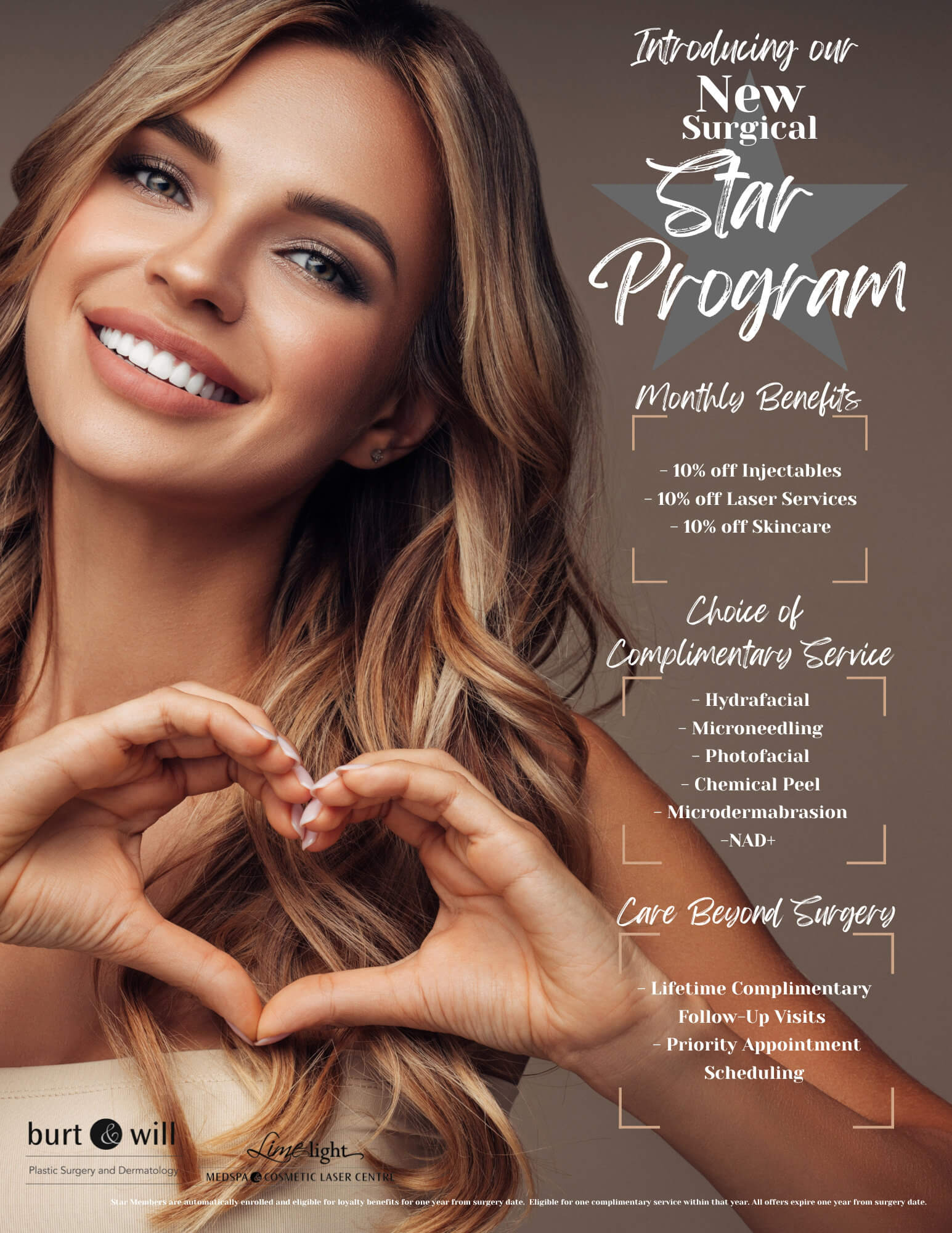 STAR members receive ongoing benefits including 10% savings on injectables, laser services, and skincare, along with priority appointment scheduling and lifetime complimentary follow-up visits with our surgical team.